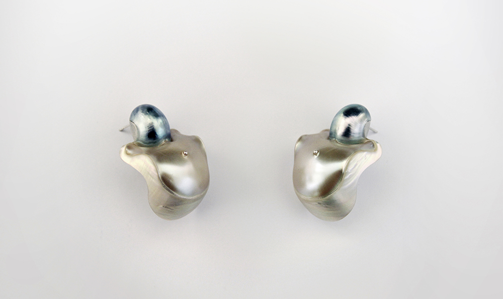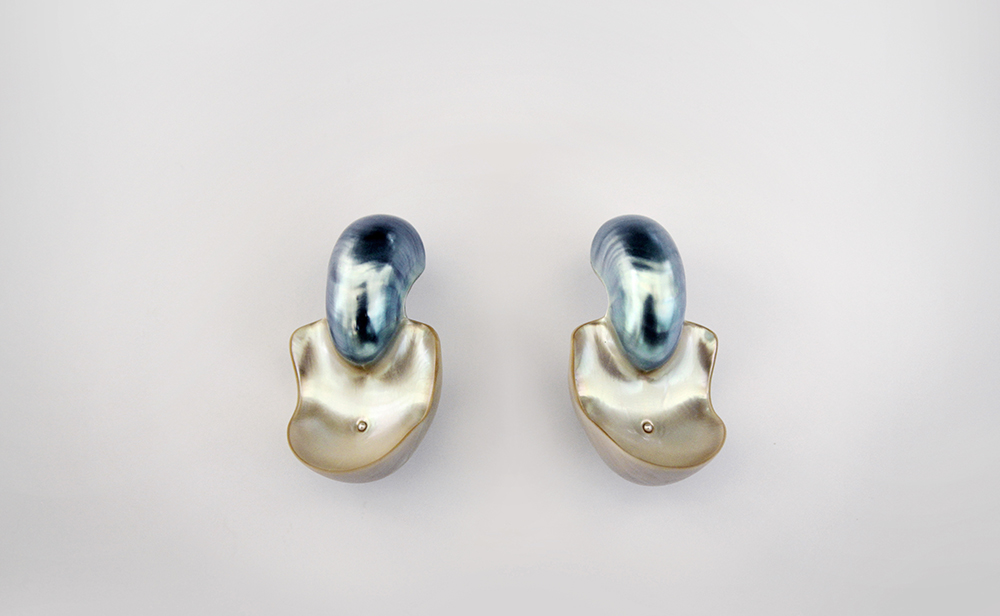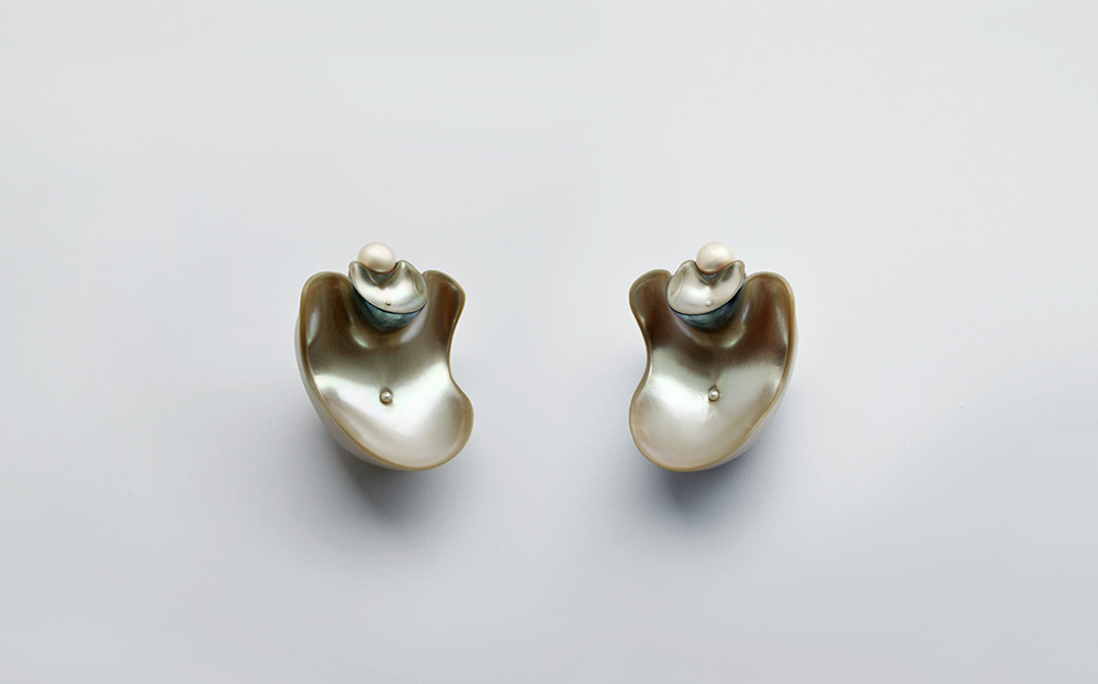 Cut from the nacre of a seashell, these earrings take shape from the shell’s hollow, voluminous forms, meticulous work revealing contours we instinctively recognize as earrings shaped by human hands.